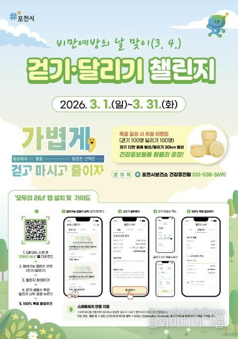 박은숙 포천시보건소장은 “월별 테마형 챌린지를 통해 시민들이 일상 속에서 꾸준히 신체활동을 이어갈 수 있도록 지원하고 있다”며 “앞으로도 시민 참여형 건강생활실천 프로그램을 체계적으로 확대해 나가겠다”고 밝혔다.