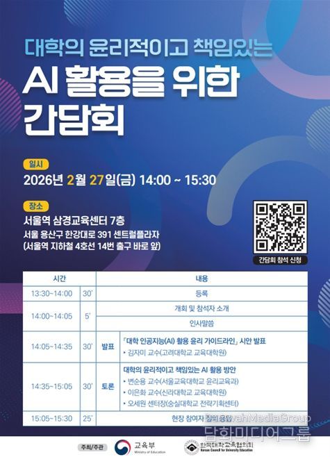 시민행정신문 김학영 기자 | 교육부와 한국대학교육협의회(회장 양오봉)는 2월 27일, 서울역 삼경교육센터에서 ‘대학 인공지능(AI) 활용 윤리 지침(가이드라인) 마련을 위한 간담회’를 개최한다.