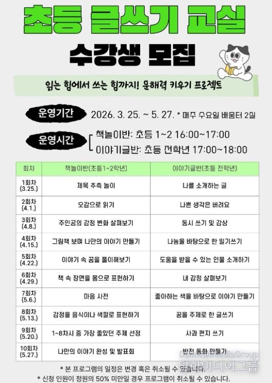 책놀이반은 다양한 책놀이 중심 활동을 통해 기초 문해력을 자연스럽게 익히도록 돕고, 이야기글반은 주제 탐구와 글쓰기 활동을 통해 사고력과 표현력 향상에 중점을 두고 운영될 예정이다.