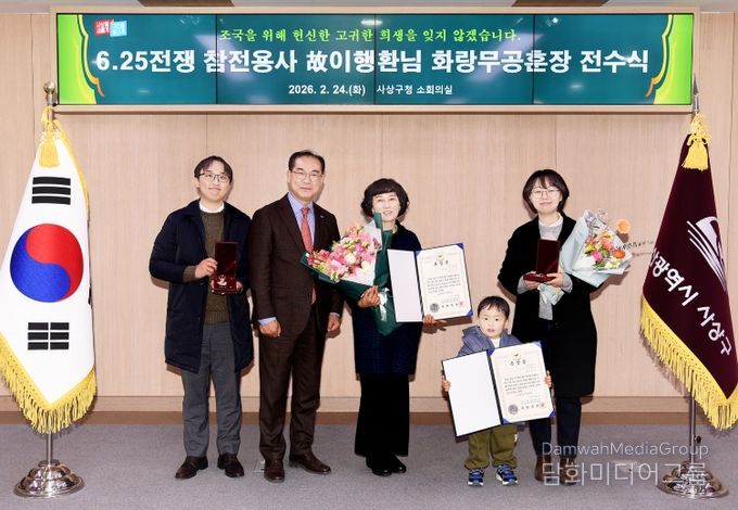 시민행정신문 강갑수 기자 | 부산 사상구는 지난 24일 구청 소회의실에서 6‧25전쟁 참전용사 故 이행환 병장의 유가족에게 화랑무공훈장을 전수했다.