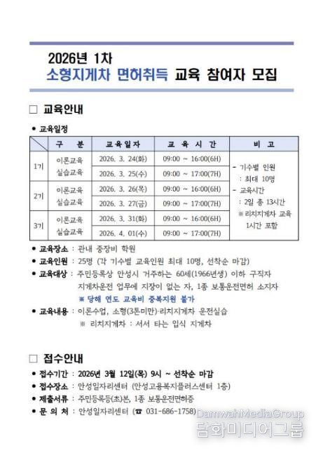 시민행정신문 강갑수 기자 | 안성시는 2026년 맞춤형 취업지원 교육의 일환으로 오는 3월 12일부터 ‘1차 소형지게차 면허취득 교육’에 참여할 교육생을 모집한다.