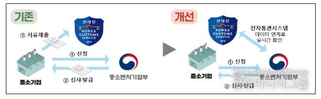앞으로는 세관에서 전자통관시스템(UNI-PASS)을 통해 중소기업 여부를 실시간으로 직접 확인할 수 있게 됨에 따라, 기업은 중소벤처기업부에 중소기업확인서를 신청한 후 발급받기만 하면 세관에 별도의 종이 서류를 제출하지 않아도 된다. 이를 통해 종이 사용을 줄일 뿐만 아니라, 행정 처리 시간을 단축하고 증명서류의 위·변조 가능성을 원천 차단하여 행정의 신뢰성을 높이는 ‘일석삼조’의 효과를 거둘 것으로 기대된다.