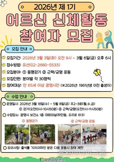 시민행정신문 기자 | 광명시 보건소가 지역 어르신들의 건강 증진과 신체 기능 향상을 돕기 위해 ‘2026년 제1기 어르신 신체활동 프로그램’ 참여자를 모집한다.