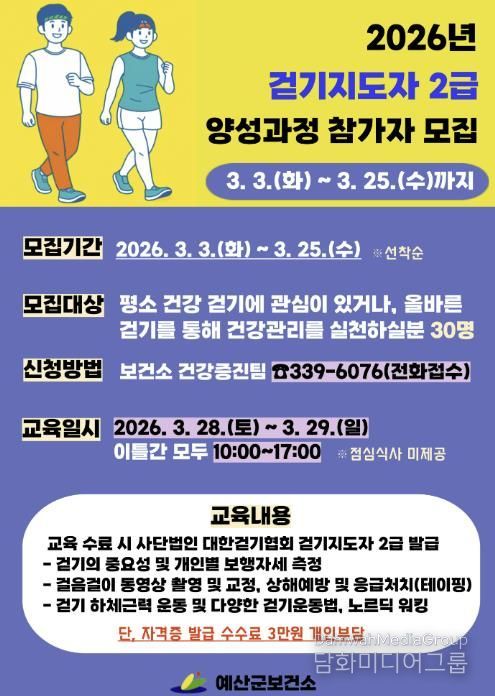 시민행정신문 기자 | 예산군보건소는 주민의 건강한 생활습관 정착과 걷기 활성화를 위해 걷기지도자 2급 양성과정 교육 참가자 30명을 선착순 모집한다.