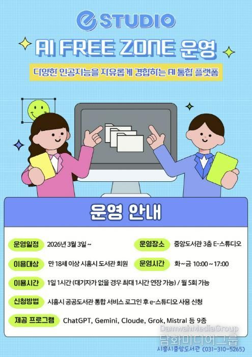 시민행정신문 강갑수 기자 | 시흥시중앙도서관은 시민들의 인공지능(AI) 활용 역량 강화를 위해 시 정보통신과와 협업해 도서관 3층 e-스튜디오에 ‘인공지능(AI) 프리 존(Free Zone)’을 구축하고, 오는 3월 3일부터 본격 운영에 들어간다.