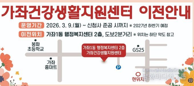 시민행정신문 기자 | 인천 서구는 가좌건강생활지원센터가 오는 2026년 3월 9일(월)부터 임시청사로 이전해 업무를 개시한다고 밝혔다.