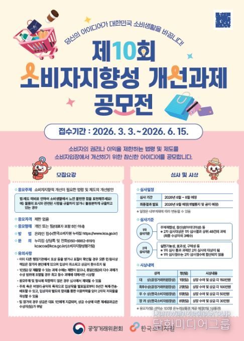 이번 공모전을 통해 생활밀착형 제도개선 과제를 발굴하여, 실제 소비자지향적 제도개선으로 이어질 수 있도록 추진할 예정이며, 공모전과 관련한 자세한 사항은 3일부터 한국소비자원 누리집을 통해 확인할 수 있다.