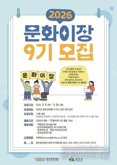 시민행정신문 강갑수 기자 | (재)완주문화재단은 지역 문화 활성화를 이끌어갈 '2026 문화이장 9기' 13명을 오는 3월 24일까지 모집한다.