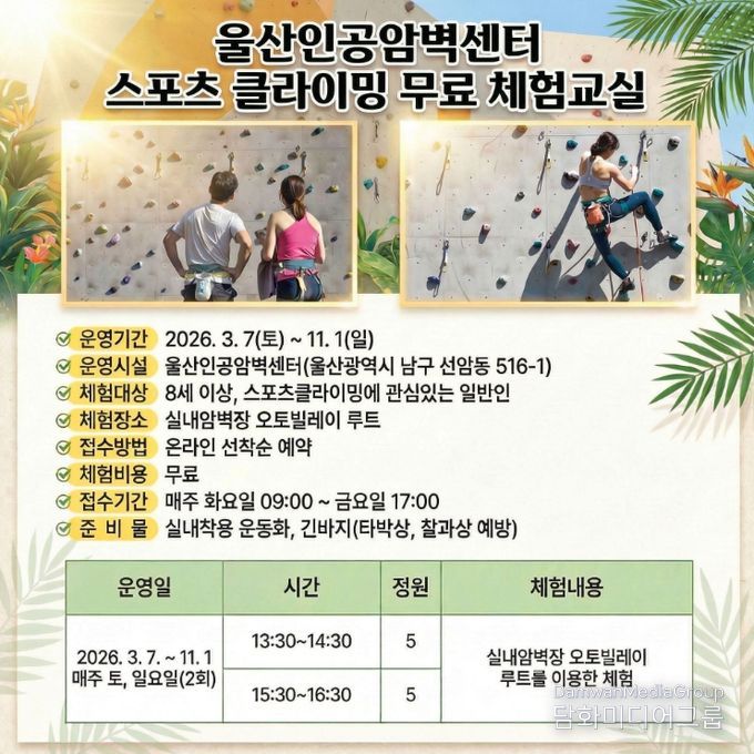 체험교실은 △안전수칙 교육 및 장비 사용법 △기본 등반 자세와 홀드 잡기 △탑로프 및 볼더링 기초 실습 △수준별 루트 도전 과정으로 구성된다.