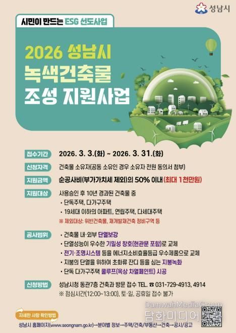 시민행정신문 강갑수 기자 | 성남시는 노후 건축물의 에너지 효율을 높이고 온실가스 배출을 줄이기 위해 ‘2026년 성남시 녹색건축물 조성 지원사업’을 시행한다. 단열재 보강과 고효율 창호 교체 등 에너지 성능 개선 공사비를 최대 1000만원까지 지원한다.