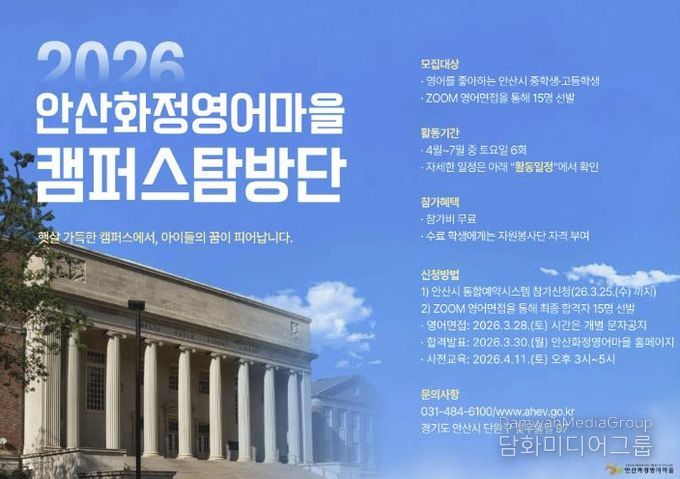 시민행정신문 강갑수 기자 | 안산시가 설립하고 안산대학교가 운영하는 안산화정영어마을은 안산시 청소년의 글로벌 역량 강화와 자기 주도적 진로 설계를 지원하기 위해 ‘글로벌리더스 캠퍼스탐방단’을 모집한다고 4일 밝혔다.