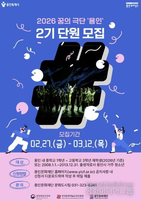 시민행정신문 강갑수 기자 | 용인문화재단은 2월 27일부터 3월 12일까지 '2026 꿈의 극단 ’용인’' 2년차 사업에 함께할 신규 단원을 모집한다.