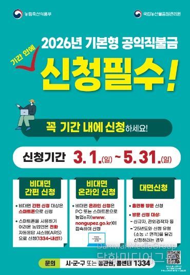 시민행정신문 이세훈 기자 | 금산군 농업·농촌의 공익기능 증진과 농업인의 소득 안정을 위한 2026년도 기본형 공익직접지불금 등록을 오는 5월 31일까지 접수한다.