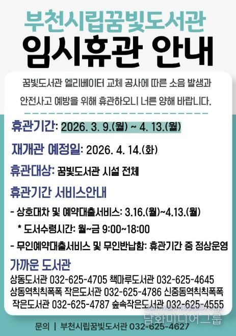 시민행정신문 강갑수 기자 | 부천시립꿈빛도서관은 노후 엘리베이터 전면 교체 공사를 위해 3월 9일부터 4월 13일까지 임시휴관한다. 공사 과정에서 분진과 소음 발생이 불가피한 만큼 이용자 안전을 확보하고 시민 불편을 최소화하기 위해 전면 휴관 후 공사를 진행한다.