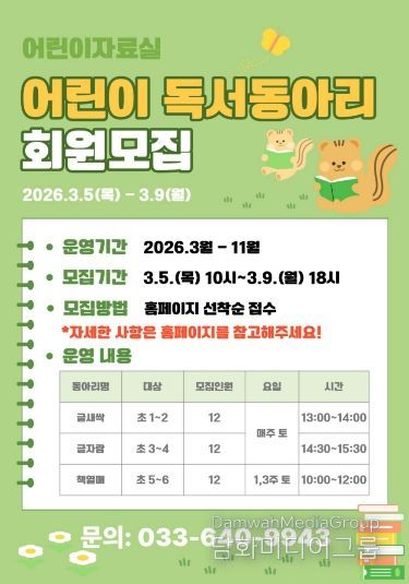 시민행정신문 기자 | 강릉교육문화관은 초등학생들을 대상으로 3월 14일부터 2026년 어린이 독서동아리를 운영한다.