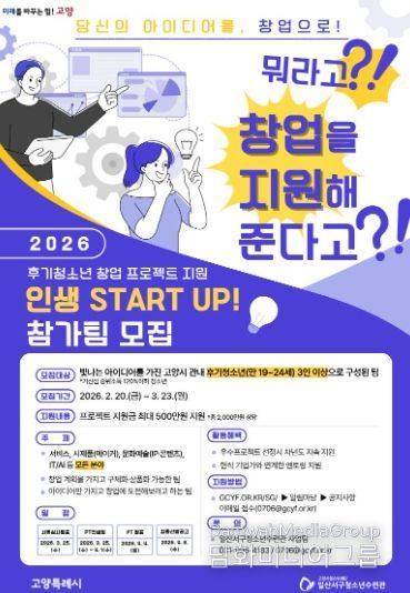 시민행정신문 강갑수 기자 | 고양시청소년재단 일산서구청소년수련관은 청소년 또는 청년들이 자신의 삶과 진로를 주도적으로 설계하고 실행 역량을 키울 수 있도록 지원하는 ‘2026 인생스타트업’ 사업 참여자를 모집한다.