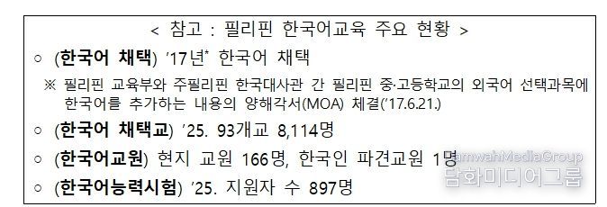 필리핀은 2017년에 현지 정규 교육과정의 외국어 과목으로 한국어를 정식 채택하는 것으로 결정하고, 2018년부터 한국어반을 운영해 왔다. 현재는 90여 개 학교에서 8,000여 명의 학생들이 한국어를 배우고 있다. 이번 양해각서는 한국 교육부가 필리핀 내 한국어 교사들을 위한 집중 연수 과정을 지원하여, 한국어교육 전문성을 높이도록 하는 내용이 핵심이다.