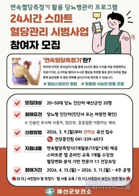 시민행정신문 기자 | 예산군보건소는 오는 3월 9일부터 ‘24시간 스마트 혈당관리 시범사업’ 참여자 20명을 선착순 모집한다.