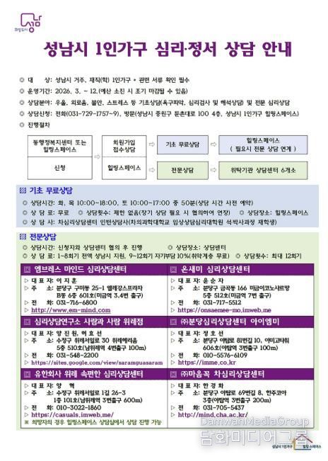 시민행정신문 강갑수 기자 | 성남시는 우울감이나 외로움, 불안감, 스트레스로 어려움을 겪는 1인 가구에 전문적인 심리·정서 상담을 지원한다고 5일 밝혔다.