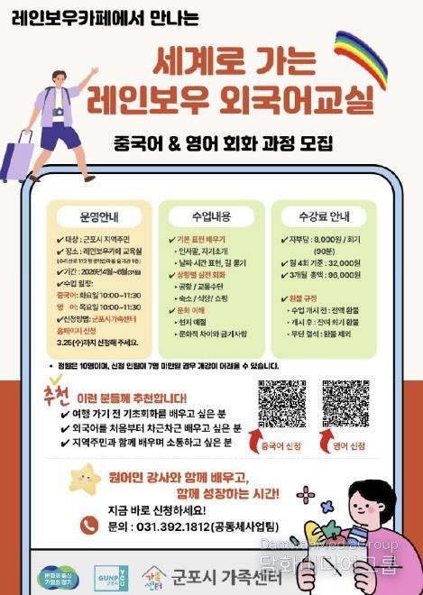 시민행정신문 강갑수 기자 | 군포시가족센터는 군포시민을 위한 실생활 외국어 회화 프로그램 ‘세계로 가는 레인보우 외국어교실’을 오는 4월부터 레인보우카페 교육실에서 운영한다.