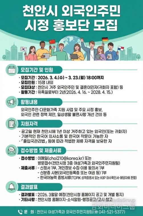 시민행정신문 강갑수 기자 | 천안시가 외국인 주민의 시각으로 지역 소식을 전하고 시정 운영에 참여할 ‘2026년 천안시 외국인주민 시정 홍보단’을 모집한다.