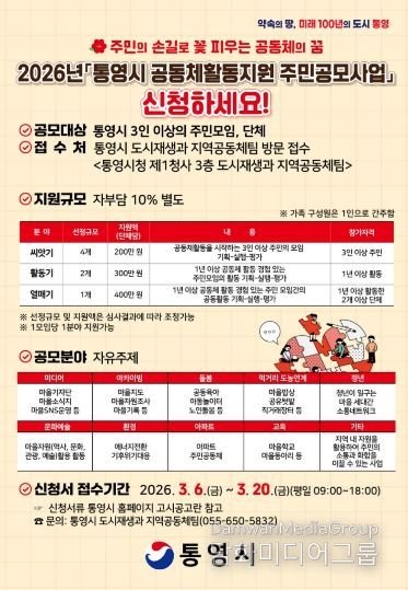 시민행정신문 강갑수 기자 | 통영시는 주민 스스로 계획하고 공동체적 방식으로 추진하는 활동을 지원하기 위해 2026년'통영시 공동체활동지원 주민공모사업'에 참여할 공동체를 오는 6일부터 20일까지 모집 접수한다.