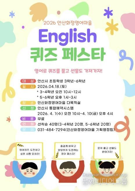 시민행정신문 강갑수 기자 | 안산시가 설립하고 안산대학교가 운영하는 안산화정영어마을은 4월 1일부터 4월 10일까지 원어민과 함께하는 ‘English 퀴즈 페스타’ 참가자를 선착순 모집한다고 5일 밝혔다.