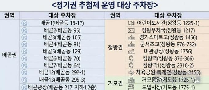 이번 추첨 대상 공영주차장은 배곧권의 배곧1~7호, 배곧12~13호, 배곧광장 10개소와 정왕권의 어린이도서관, 정왕우체국, 경기스마트고, 군서초교, 미관광장, 정왕역, 정왕역1, 체육공원 복개천 8개소, 거모권의 거모중앙, 도일시장 주차장 2개소를 포함하여 총 20개소다.
