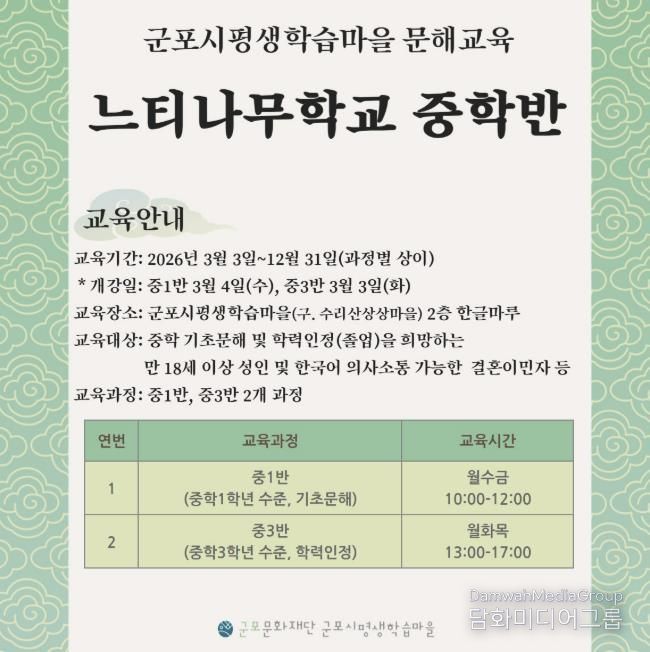 시민행정신문 강갑수 기자 | 군포문화재단 군포시평생학습마을은 지난 3일 성인 문해교육 프로그램 ‘느티나무학교’를 개강했다고 밝혔다.