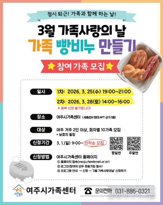 참여 신청은 4월 1일부터 선착순으로 모집하며, 여주시 거주 가족이라면 누구나 신청 가능하다. 자세한 사항은 여주시가족센터 홈페이지를 통해 확인할 수 있다.
