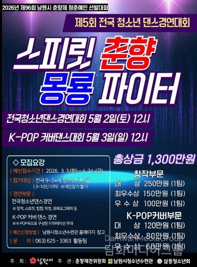 참가 신청은 오는 4월 24일까지며, 참가를 희망하는 팀은 남원시청 또는 남원청소년수련관 홈페이지에서 신청 양식을 내려받아 작성한 후 댄스 영상과 함께 이메일로 제출하면 된다.