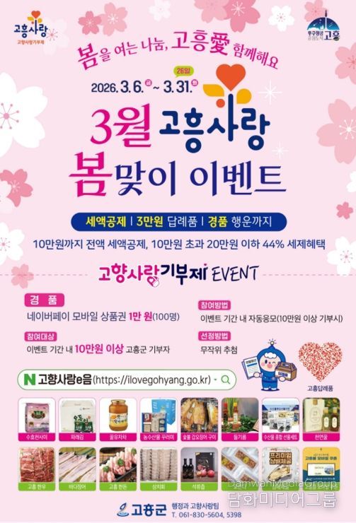 시민행정신문 강갑수 기자 | 고흥군은 3월을 맞아 고향사랑기부제 참여 확대를 위한 ‘봄맞이 이벤트’를 추진한다고 밝혔다.