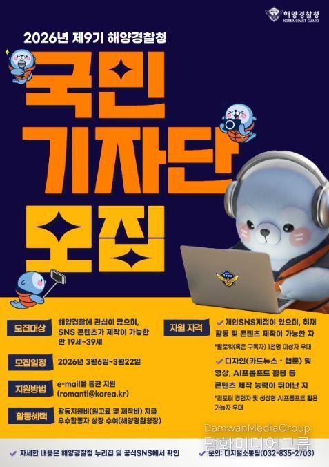 시민행정신문 이존영 기자 | 해양경찰청은 청년층의 국가 정책 참여 기회를 확대하고, 국민 눈높이에 맞는 해양경찰 정책 콘텐츠를 확산하기 위해 ‘2026년도 제9기 해양경찰청 국민기자단’을 모집한다고 밝혔다.