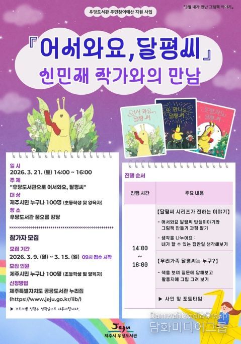 시민행정신문 기자 | 제주시 우당도서관은 성장기 어린이들의 건강한 독서습관 형성과 창의력 향상을 위해 ‘어서와요, 달평씨’의 저자 신민재 그림책 작가와의 만남을 3월 21일 개최한다.
