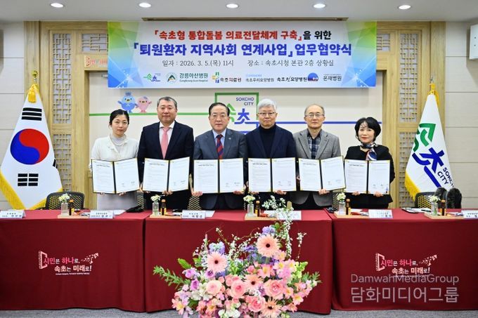 이병선 속초시장은 “이번 업무협약은 일시적 치료에 머무르지 않고 지역사회 안에서 지속 가능한 돌봄 환경을 구축하는 계기가 될 것”이라며 “의료기관과의 협력을 더욱 강화해 시민이 익숙한 생활공간에서 안심하고 건강한 삶을 이어갈 수 있도록 최선을 다하겠다”고 말했다.