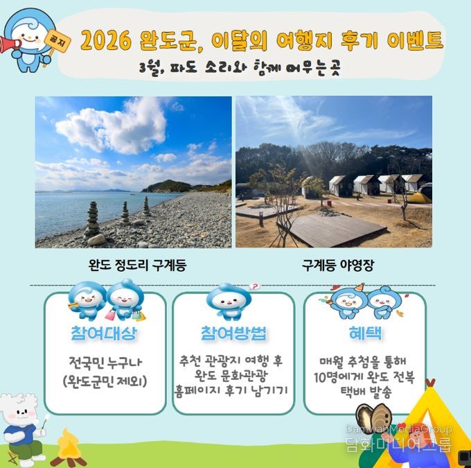 이벤트는 국민 누구나(완도군민 제외) 참여할 수 있으며, 참여 방법은 매월 완도군이 선정·추천하는 관광지를 방문한 뒤 ‘완도군 문화관광 누리집(관광 이야기)’에 여행 후기를 작성하면 된다.