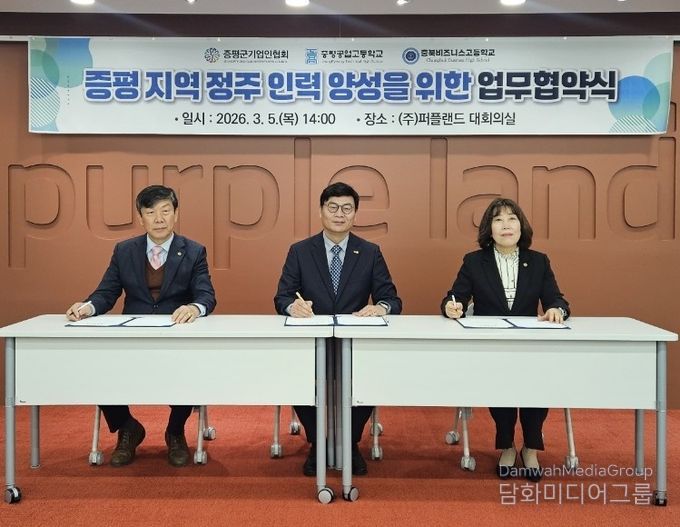 협회는 5일 퍼플랜드 회의실에서 증평공업고등학교, 충북비즈니스고등학교와 ‘지역 정주 미래 기술 인력 양성을 위한 업무협약(MOU)’을 체결했다.
