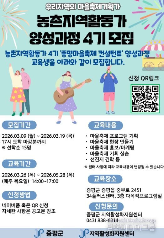 시민행정신문 강갑수 기자 | 충북 증평군 지역활성화지원센터가 이달 9일부터 19일까지 농촌지역활동가 4기 ‘증평마을축제 컨설턴트’ 양성과정 교육생을 모집한다.