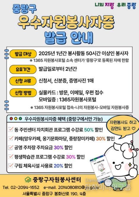 류경기 중랑구청장은 “자원봉사자들의 참여가 지역사회에 큰 힘이 되고 있다”며 “실질적인 혜택을 확대하고 예우 체계를 정비해 자원봉사자의 자긍심을 높일 수 있도록 관련 정책을 지속적으로 강화해 나가겠다”고 말했다.