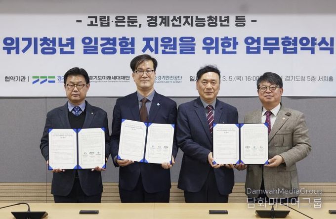 시민행정신문 강갑수 기자 | 경기도와 경기도미래세대재단, 한국승강기안전공단 경인지역본부는 5일 경기도청 서희홀에서 ‘위기청년 일경험 지원을 위한 업무협약’을 체결했다.