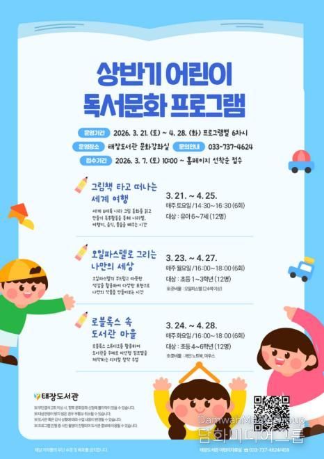 시민행정신문 강갑수 기자 | 원주시 태장도서관은 3월부터 4월까지 관내 유아와 아동을 대상으로 ‘2026년 상반기 어린이 독서문화 프로그램’을 운영한다.
