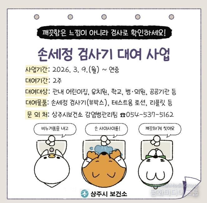 시민행정신문 기자 | 상주시보건소는 지역 어린이집, 유치원, 학교, 공공기관 등을 대상으로 올바른 손씻기 습관 형성과 감염병 예방을 위한 ‘손세정 검사기 대여 서비스’를 3월부터 연중 운영한다고 밝혔다.