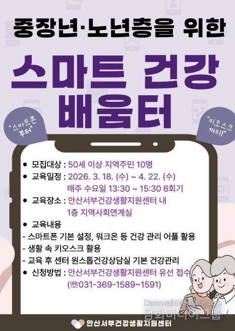 시민행정신문 기자 | 안산시는 단원보건소 서부건강생활지원센터는 오는 18일부터 ‘중장년‧노년층을 위한 스마트 건강 배움터’를 운영한다고 6일 밝혔다.