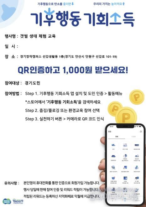 '기후행동 기회소득'은 경기도가 도민과 함께 탄소중립 실천을 위해 경기환경에너지진흥원 주관으로 추진하는 참여형 정책 사업으로 도민들이 전용 어플리케이션을 통해 기후행동 실천 활동을 인증할 경우 연간 최대 1만원 범위 내에서 지역화폐 리워드를 지급받을 수 있도록 구성되어 있다. 경기창작캠퍼스는 경기 서해 바다의 생태 환경을 바탕으로 조성된 체험형 교육 공간인 ‘갯벌놀이터’ 체험 활동을 '기후행동 기회소득' 사업 중 기후행동 실천 활동 환경교육으로 승인받아 운영하게 된다.