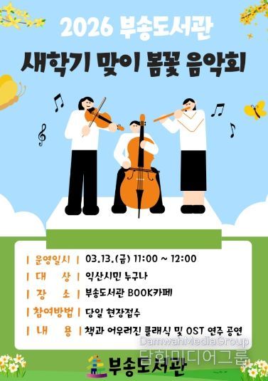 익산시는 부송도서관에서 오는 13일 오전 11시 '새학기 맞이 봄꽃 음악회'를 개최한다고 6일 밝혔다.