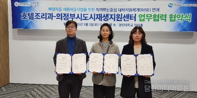 시민행정신문 강갑수 기자 | 의정부시도시재생지원센터는 3월 3일 경민대학교 호텔조리과와 성공적인 빼벌새뜰마을사업을 위해 업무협약을 체결했다.