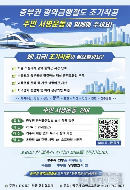 이번 서명운동은 ‘중부권 광역급행철도 조기 착공 행정협의체’가 주관하고 사업 관련 지방자치단체가 공동 취지 아래 지역별로 참여하는 방식으로 진행된다. 시는 서명에 담긴 시민 의견을 취합해 정부와 관계기관에 공식 전달할 계획이다.