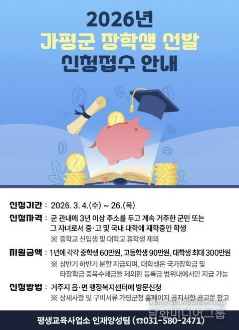 시민행정신문 강갑수 기자 | 가평군이 지역 학생들의 균등한 교육 기회를 보장하고 우수 인재를 육성하기 위해 2026년도 장학생 선발에 나선다.