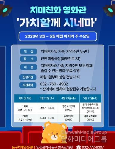 시민행정신문 강갑수 기자 | 인천 동구는 치매환자와 가족, 지역주민이 문화를 향유 할 수 있는 치매친화 영화관 ‘가치함께 시네마’를 오는 3월~5월까지 매월 마지막 주 수요일 운영한다고 밝혔다.