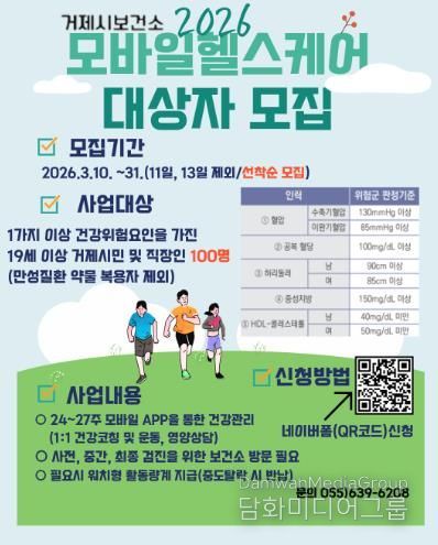시민행정신문 기자 | 거제시보건소는 오는 3월 10일부터 모바일 헬스케어사업에 참여할 시민 100명(선착순)을 모집한다.